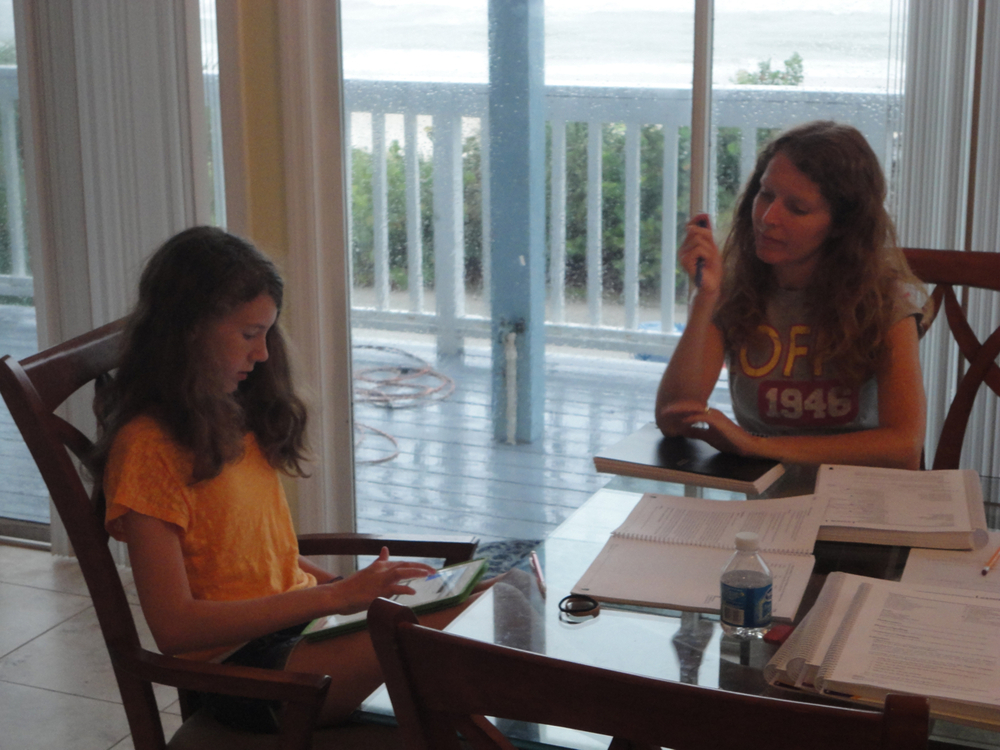 School starts promptly at 8 AM every morning. I teach math, science, history, geography and “choice time.” Choice time is a montessori-esque half hour each day. At the beginning of the week, I ask them to think up their own curriculum for that week, with some clear objective. For instance, writing and producing a short video, learning about hermit crabs, programming a computer game, etc. Each week, the subject changes based on their interests.