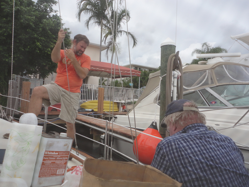 You’ll see new floors installed in what is called the “engine room passageway.” The old floors were crumbling because of water damage. Also you’ll see Kevin overseeing some work done by a contractor, David. This poor ol’ chap first started working on our boat days after we closed on it. On his first day, he was standing on some scaffolding around the boat while it was in the shipyard and he fell and broke his leg — he needed surgery to have a steel rod embedded. That happened back in June. He’s doing well now and walking with a bit of a limp.