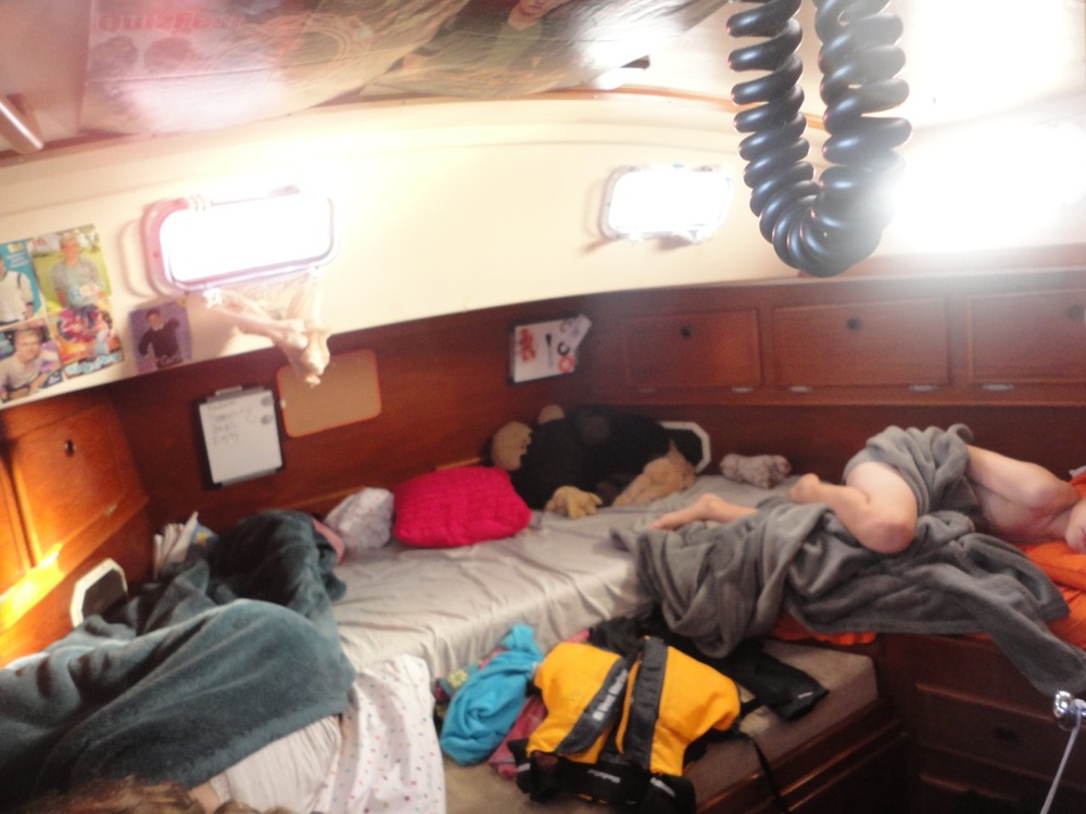 Typically the kids are both asleep when we leave. We lay out their life jackets and harnesses on the salon seatee and when they wake up they peak their heads up into the cockpit to see where we are. Occassionally, though, the motion is so smooth that they don’t realize we are sailing. This trip was one of those days.