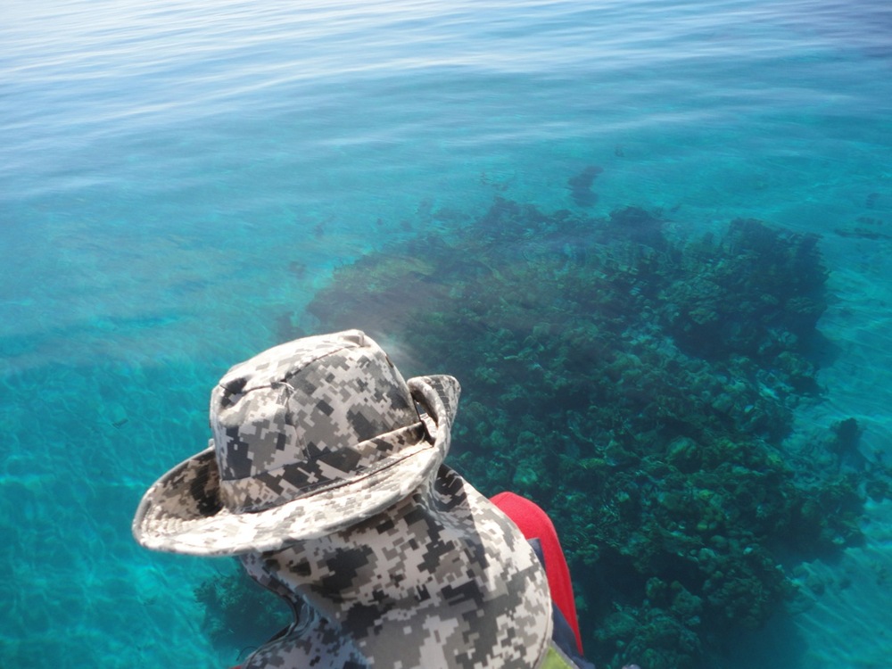 They were on the lookout for what appears to be an oil slick. Black, splotchy water. This is the tell-tale sign of a coral reef sitting under the surface. Usually they are harmless, sitting 10 or more feet deep. But, there are a few that will get you, such as this one that we passed over just a little too closely.